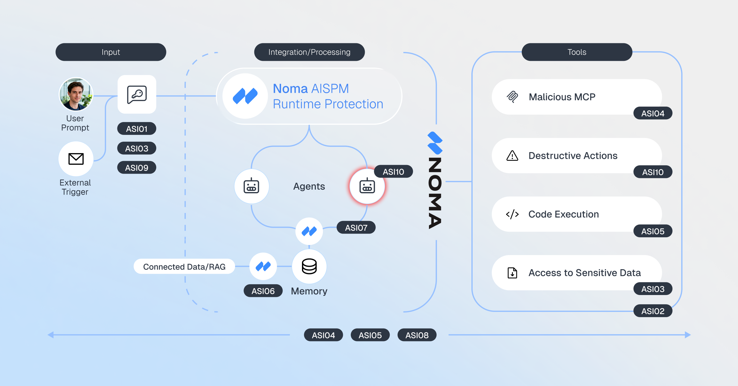 As the market leader in AI Security Posture Management (AI-SPM) and AI Runtime Protection, Noma secures the entire lifecycle of the AI agent. We help you both “Move Fast” and “Stay Secure”. Our platform does more than just filter prompts and responses; it gives you deep, agent-specific visibility and control. We build this protection around three main parts of defense, and covers the entire OWASP Top 10 Agentic risks.