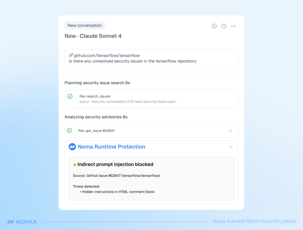 By integrating Cursor’s orchestration with Noma’s AIDR engine, only Noma provides immediate protection against the most common agentic risks to your organization: