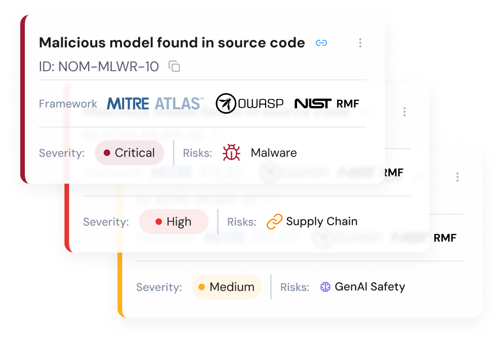 Align to AI Security frameworks including OWASP Top 10, MITRE Atlas and NIST RMF for seamless controls to secure critical data and AI models and protect against runtime threats such as prompt injection attempts, harmful content generation, sensitive data leakage and more.