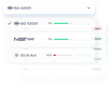 From development to runtime, proactively prepare your organization to meet emerging regulations and certifications such as the EU AI Act and ISO42001, with built in compliance that adapts to new requirements for AI as they emerge.